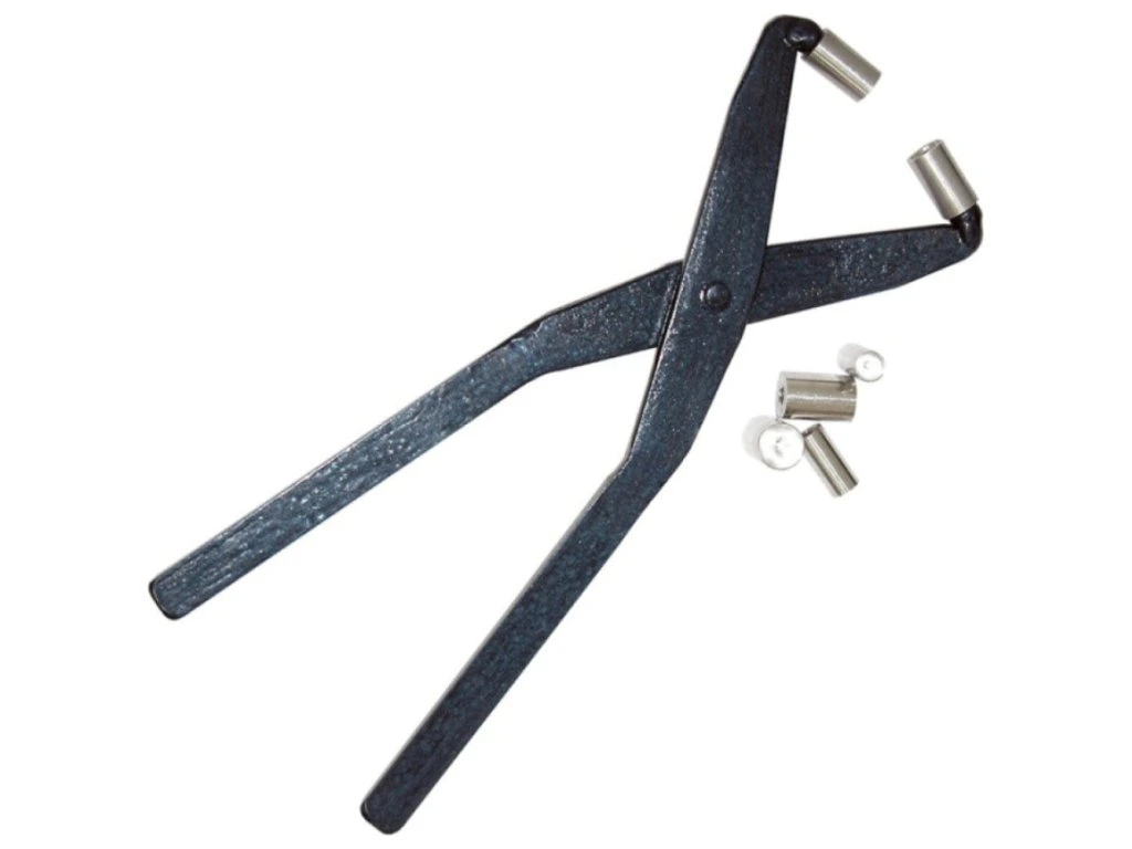 Kovové kleště na výrobu kuliček z rohlíků. Kleště jsou se třemi velikostmi čelistí.